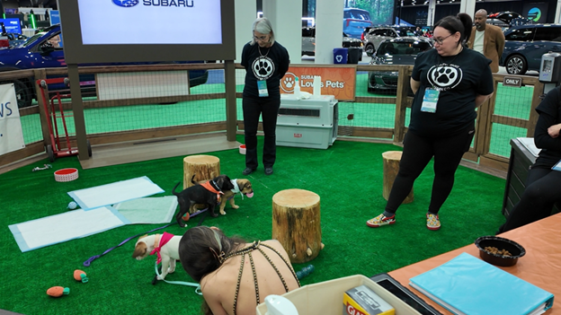 Subaru partnered with the Michigan Humane Society to bring adoptable shelter puppies — and even kittens — to the Auto Show. Visitors can sign adoption papers on site.